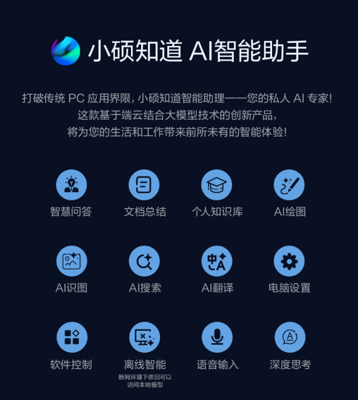小硕知道智能助理支持智慧问答、文档总结、个人知识库、AI绘图、电脑设置、软件控制、自然语言交互等丰富的功能。比如,我们可以让小硕知道对大量文本进行总结和归纳,节省时间提升效率;或是将各种文件资料放入模型中学习,构建属于自己的本地知识库;亦或是让其根据需求生成想要的图片等。而且,小硕知道具备本地化处理能力,断网时仍可继续访问本地模型运行基础功能,满足你的使用需求。